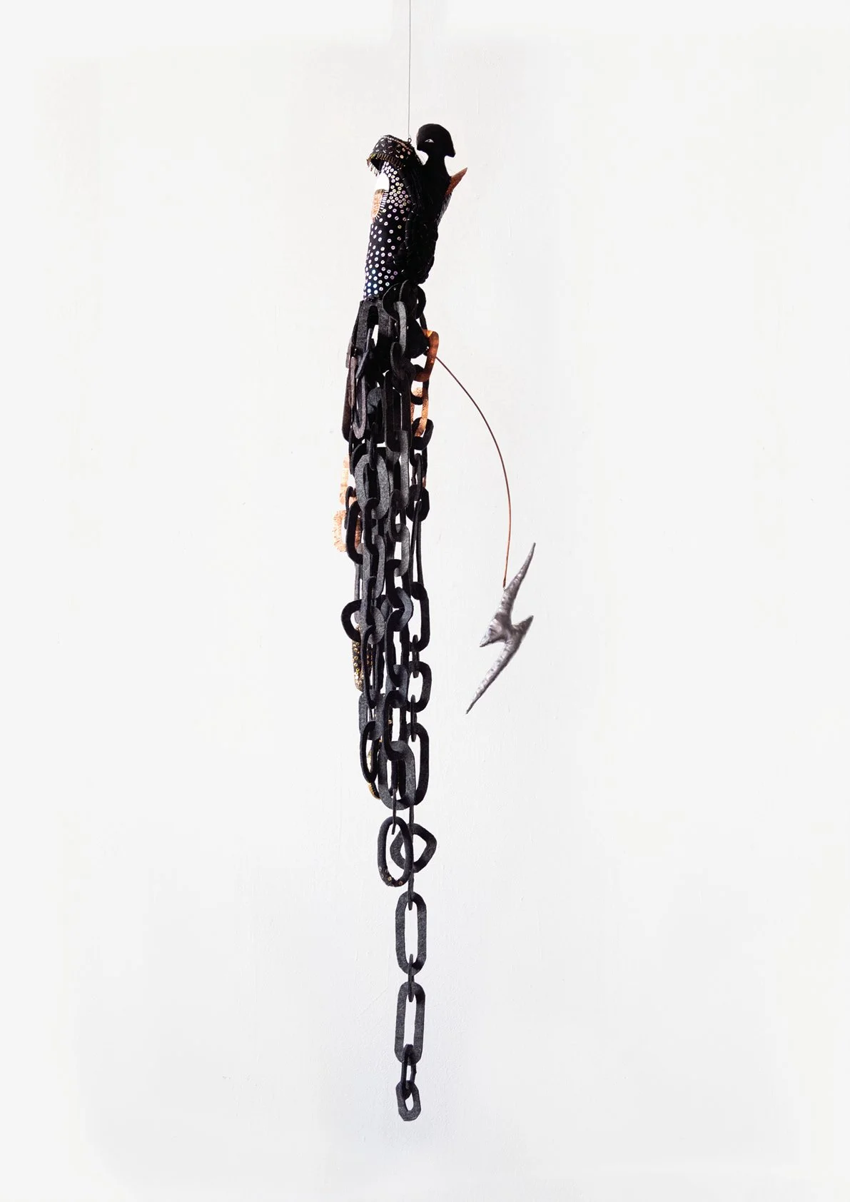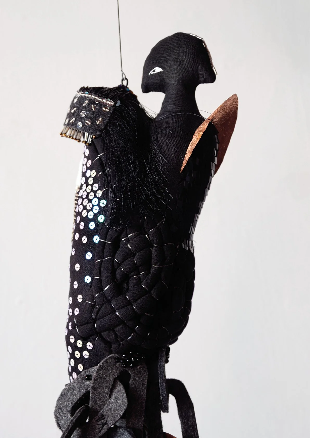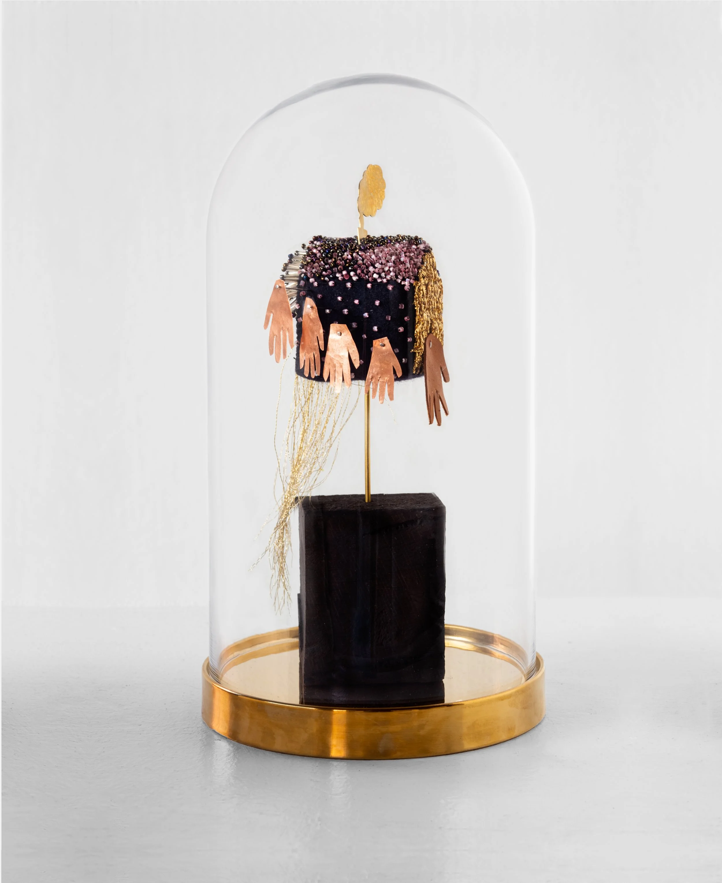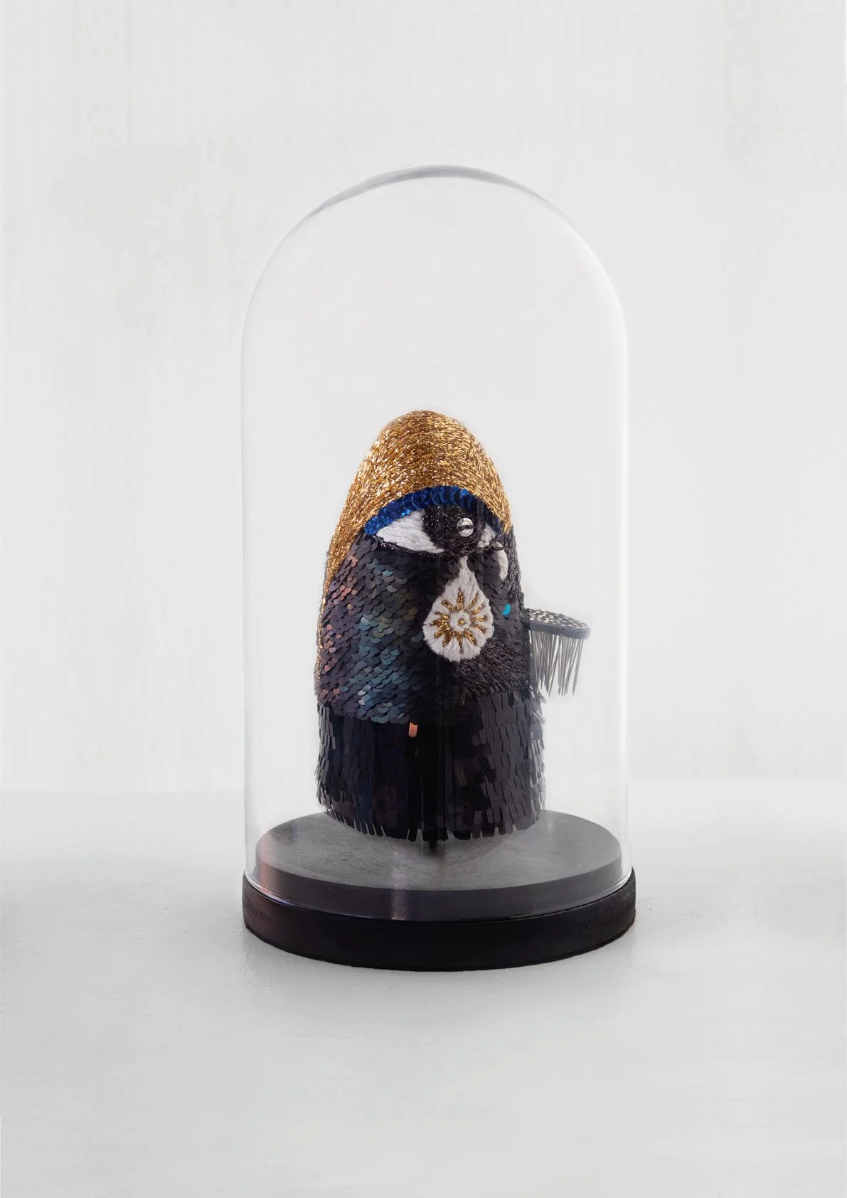 wool, silk, polyester, felt, linen, sequins, glass beads, thread, brass, copper, wood, pins, glass dome