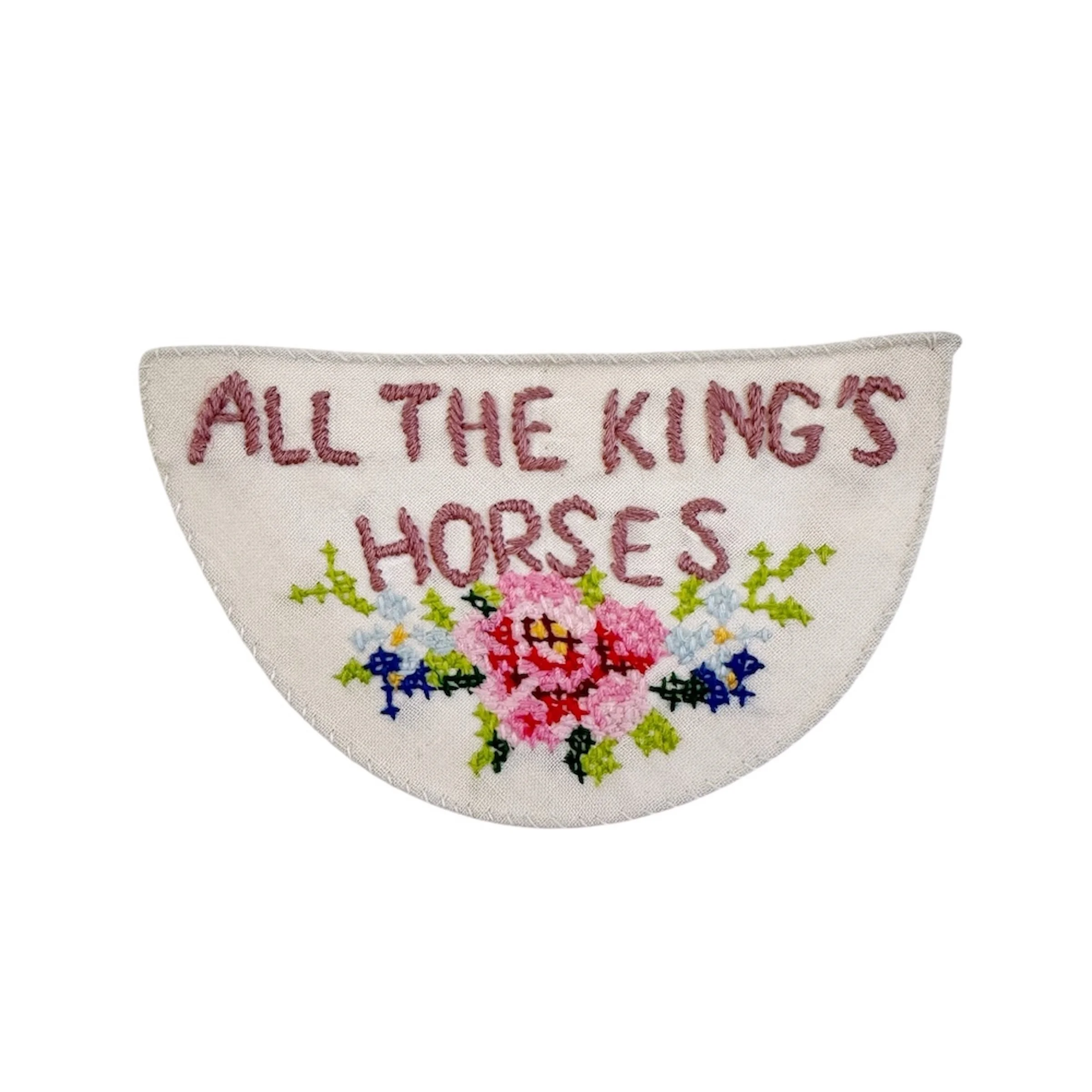 Velvet, linen, silk, cotton, wool, sequins, beads, freshwater pearls, sterling silver, copper, brass, found objects, cotton thread