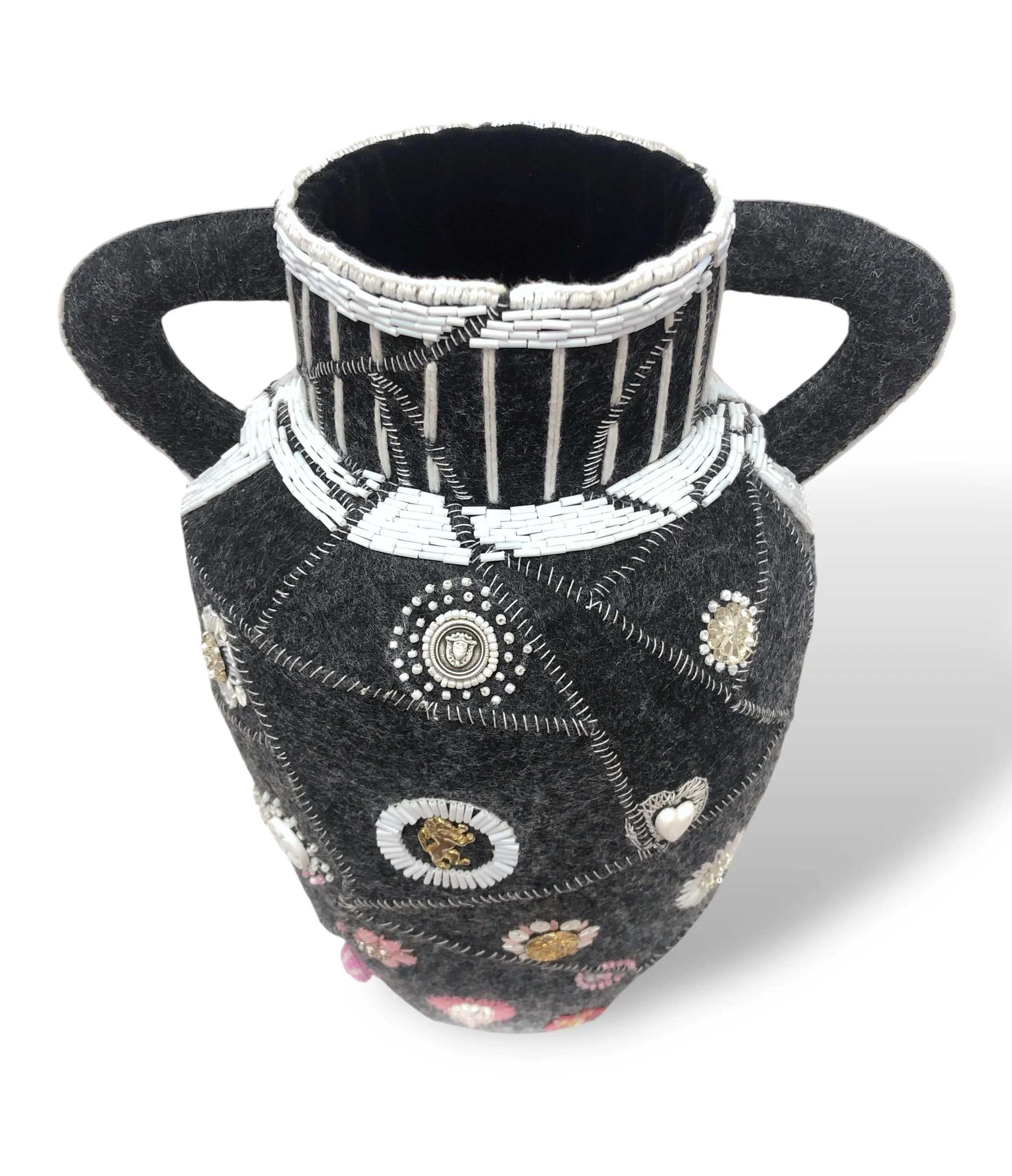 felt, velvet, sequins, glass beads, thread, buttons, found items and lead